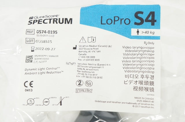 - Verathon 0574-0195 GlideScope Spectrum LoPro S4 Video Laryngoscope >40kg (x)