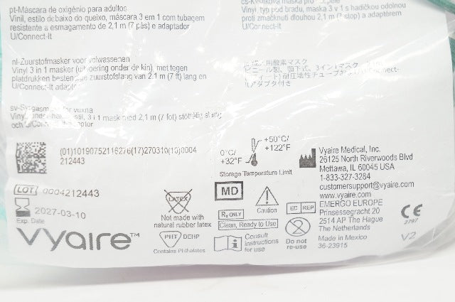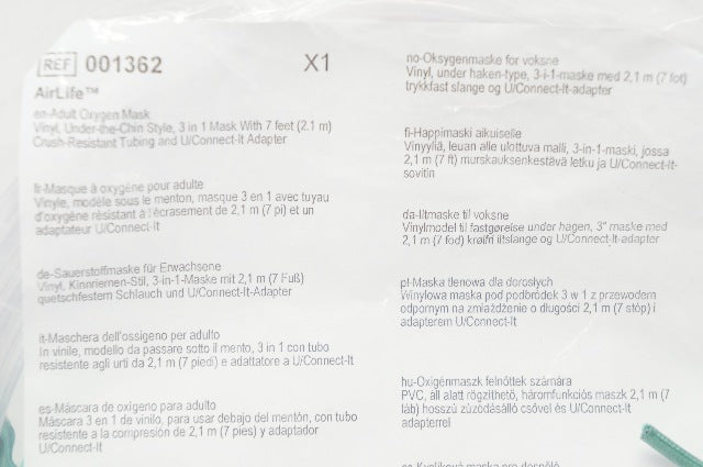 Vyaire 001362 AirLife Adult Oxygen Mask Vinyl, Chin Style, 3 in 1 MAsk With 7 ft. Crush Resistant Tubing and U/Connect-It Adapter