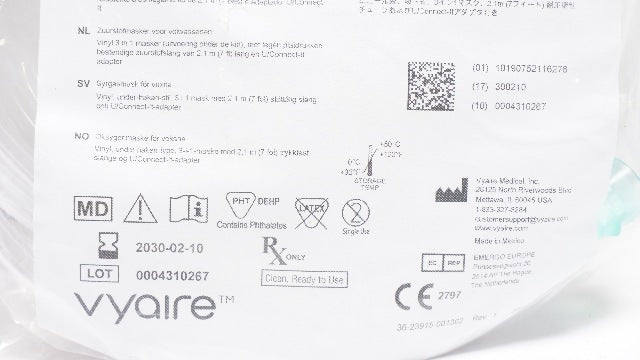 - Vyaire 001362 AirLife Adult Oxygen Mask Vinyl w/7ft. Tubing & U/Connect Adapter