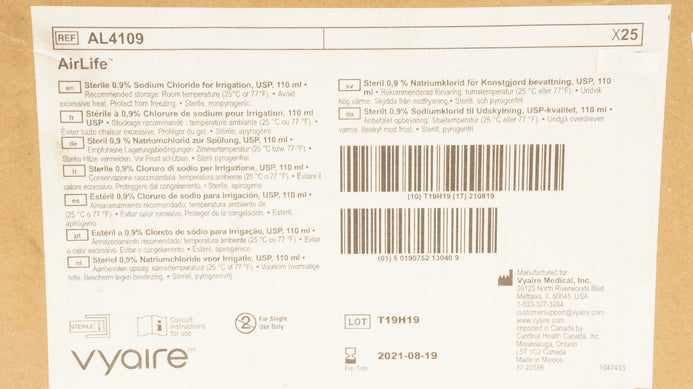 - Vyaire AL4109 AirLife Sterile 0.9% Sodium Chloride 110ml - Case of 25 (x)