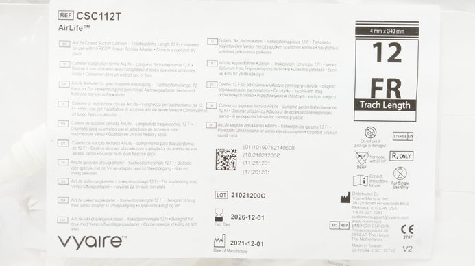- Vyaire CSC112T AirLife Closed Suction Cath. Tracheostomy Length 12Fr., 4 x 340mm