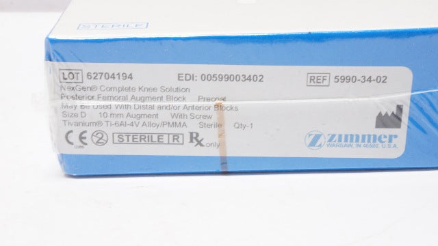 - Zimmer 5990-34-02 NexGen Posterior Femoral Augment Block, Precoat, 10mm, Size D