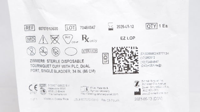 - Zimmer 60707010600 Sterile Disposable Tourniquet Cuff Dual Port, Bladder 34inch