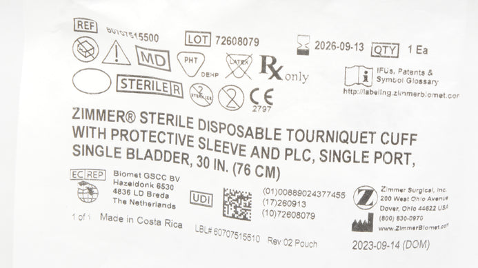 - Zimmer Surgical 60707515500 Sterile Disposable Tourniquet Cuff 30inch