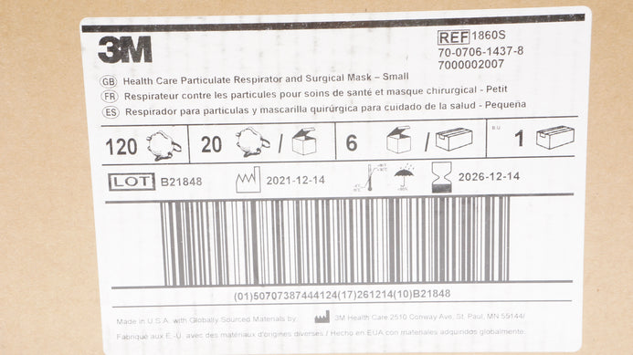3M 1860S Health Care Particulate Respirator and Surgical Mask Small- Case of 120