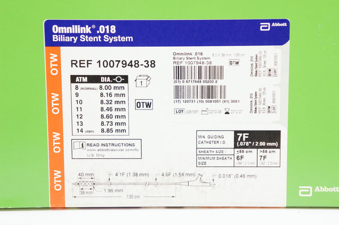- Abbott 1007948-38 Omnilink 0.018 Biliary Stnt System 8.0 x 38mm, 135cm (x)