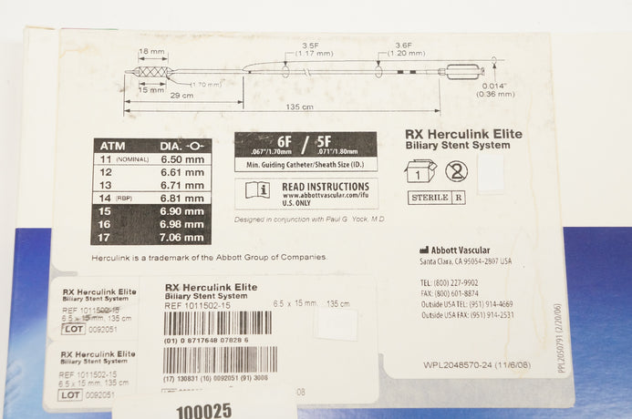 - Abbott 1011502-15 RX Herculink Elite Biliary Stnt System 6.5 x 15mm, 135cm (x)