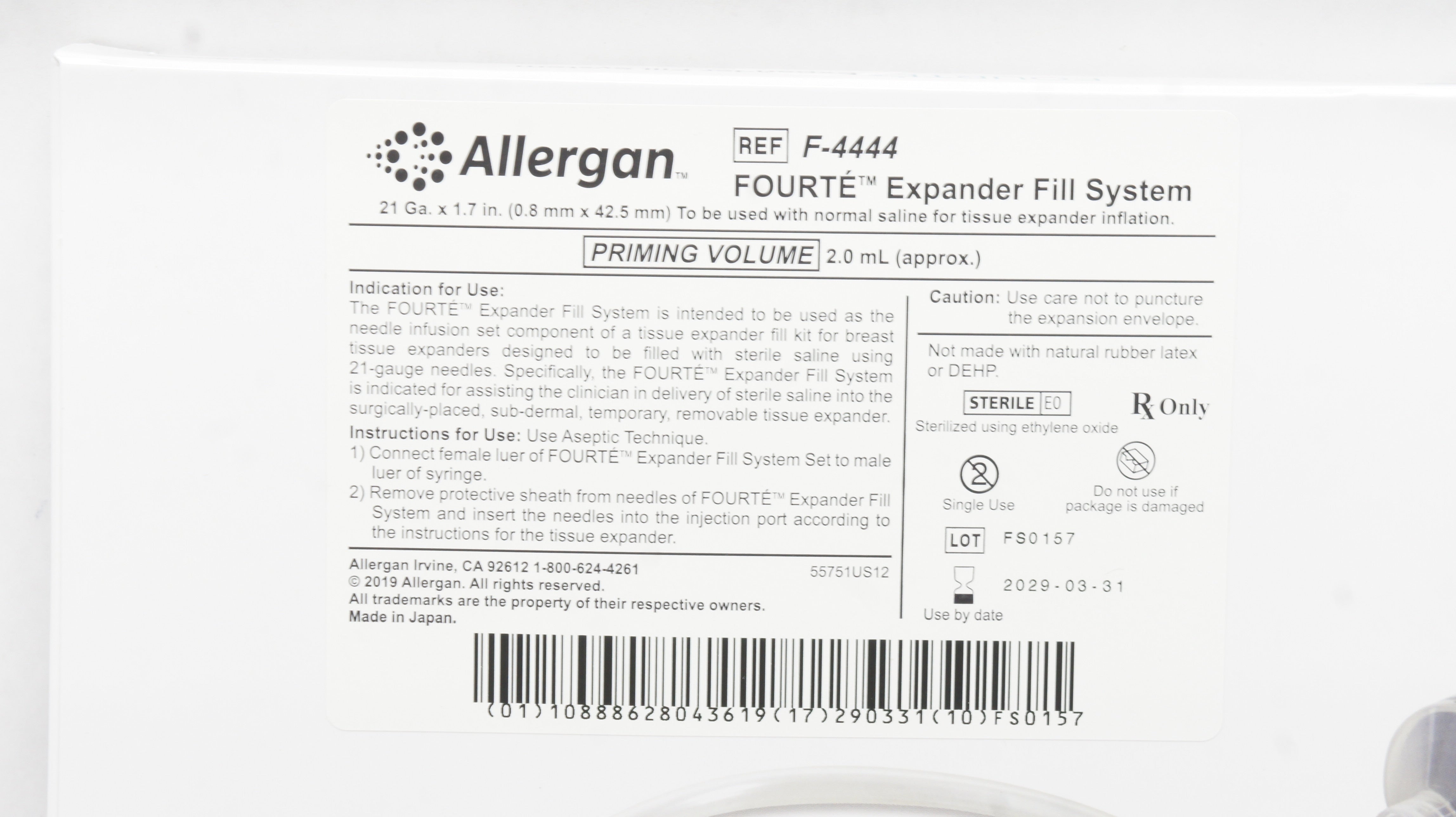 - Allergan F-4444 Fourte Expander Fill System 21 Ga x 1.7inch Priming Vol. 2.0mL