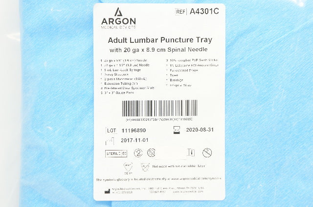 - Argon A4301C Adult Lumbar Puncture Tray w/Spinal Ndle 20 ga x 8.9 cm (x)