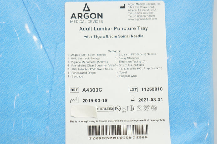 Argon A4303C Adult Lumbar Puncture Tray With 18 Ga x 8.9 cm Spinal Ndle (x)