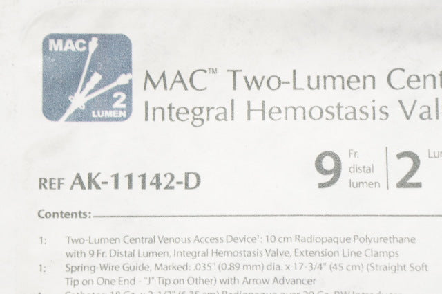 Arrow AK-11142-D MAC Two-Lumen Central Venous Access Kit W/ Integral Hemostasis Valve 9Fr x 10cm x 0.035in