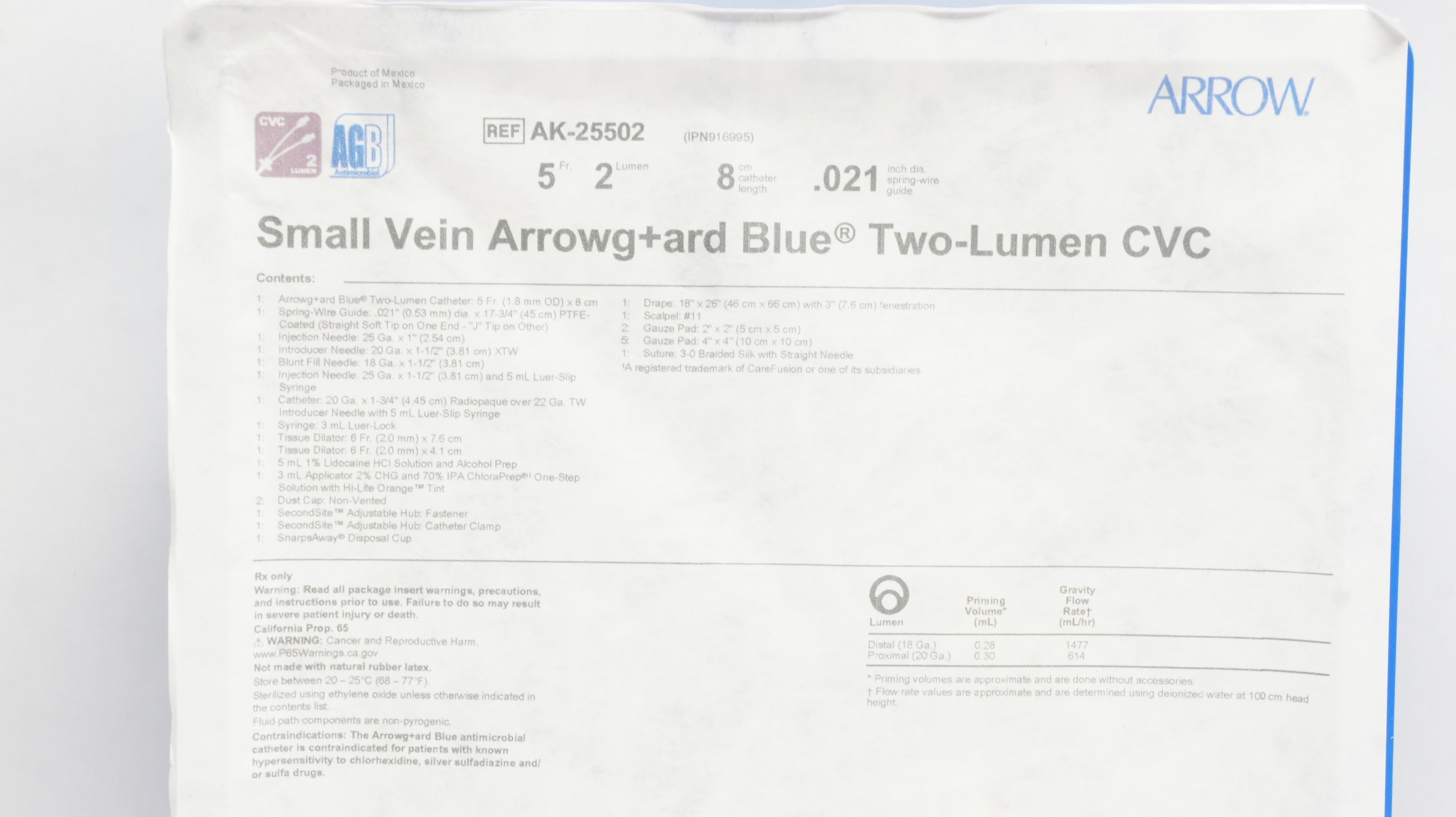 Arrow AK-25502 Small Vein Arrow+ard Blue Two-Lumen Central Venous Cath. Kit 5Fr 8cm .021inch