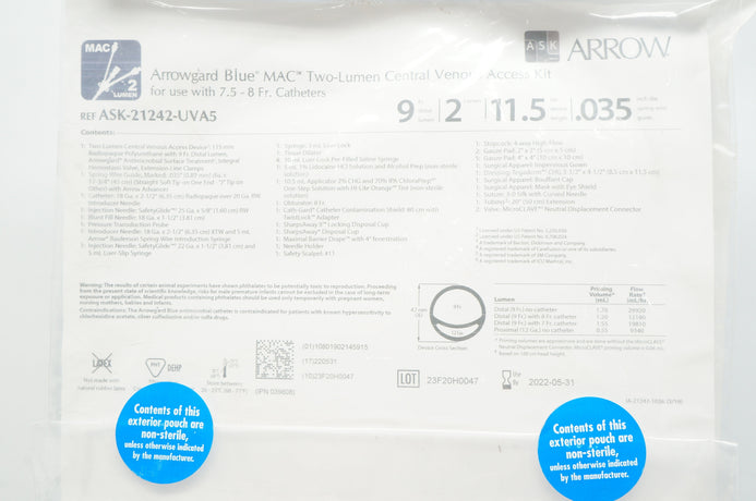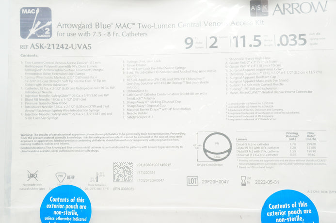- Arrow ASK-21242-UVA5 Two-Lumen Central Venous Access Kit 9Fr x 11.5cm x 0.035in.