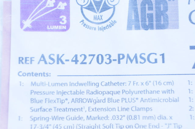 - Arrow ASK-42703-PMSG1 Multi-Lumen Central Venous Cath. Kit 3Lumen 7Fr x16cm (x)