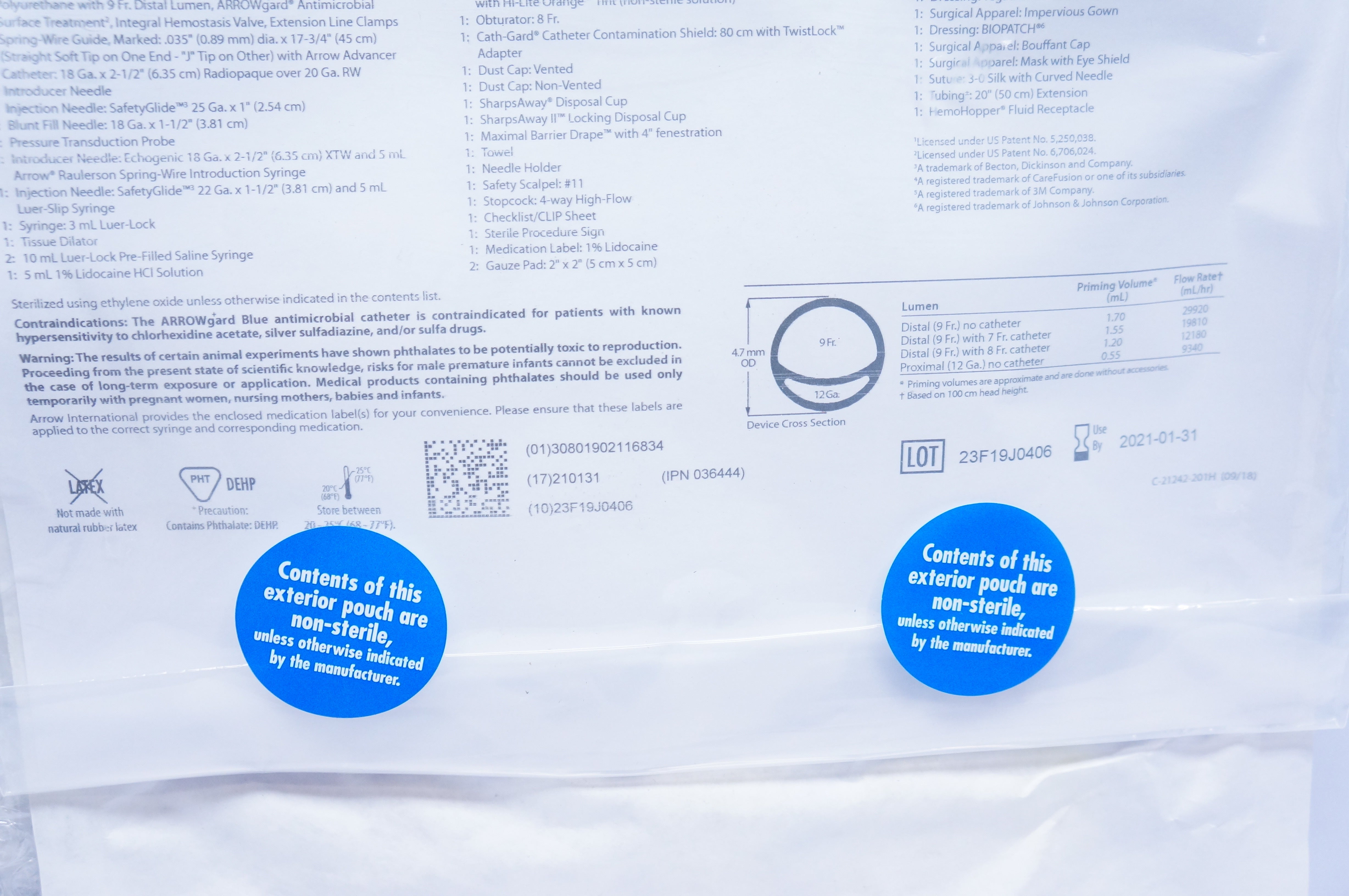 1: 115 mm Radiopaque Polyurethane with 9 Fr. Distal Lumen, ARROWg+ard Antimicrobial Surface Treatment 2, Integral Hemostasis Valve, Extension Line Clamps