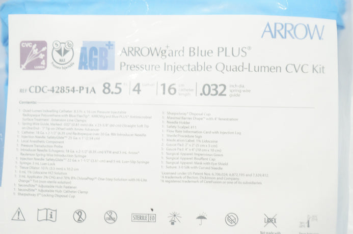 - Arrow CDC-42854-P1A Pressure Injectable Quad-Lumen CVC Kit 8.5Frx16cmx0.032in(x)