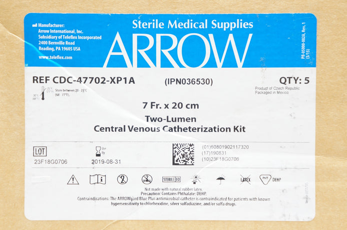 Arrow CDC-47702-XP1A 2-Lumen Central Venous Cath. Kit 7Fr x 20cm (x) - Box of 5