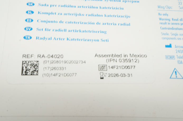 Arrow RA-04020 Radial Artery Catheterization Set 20Ga x 1 3/4inch - Box of 25