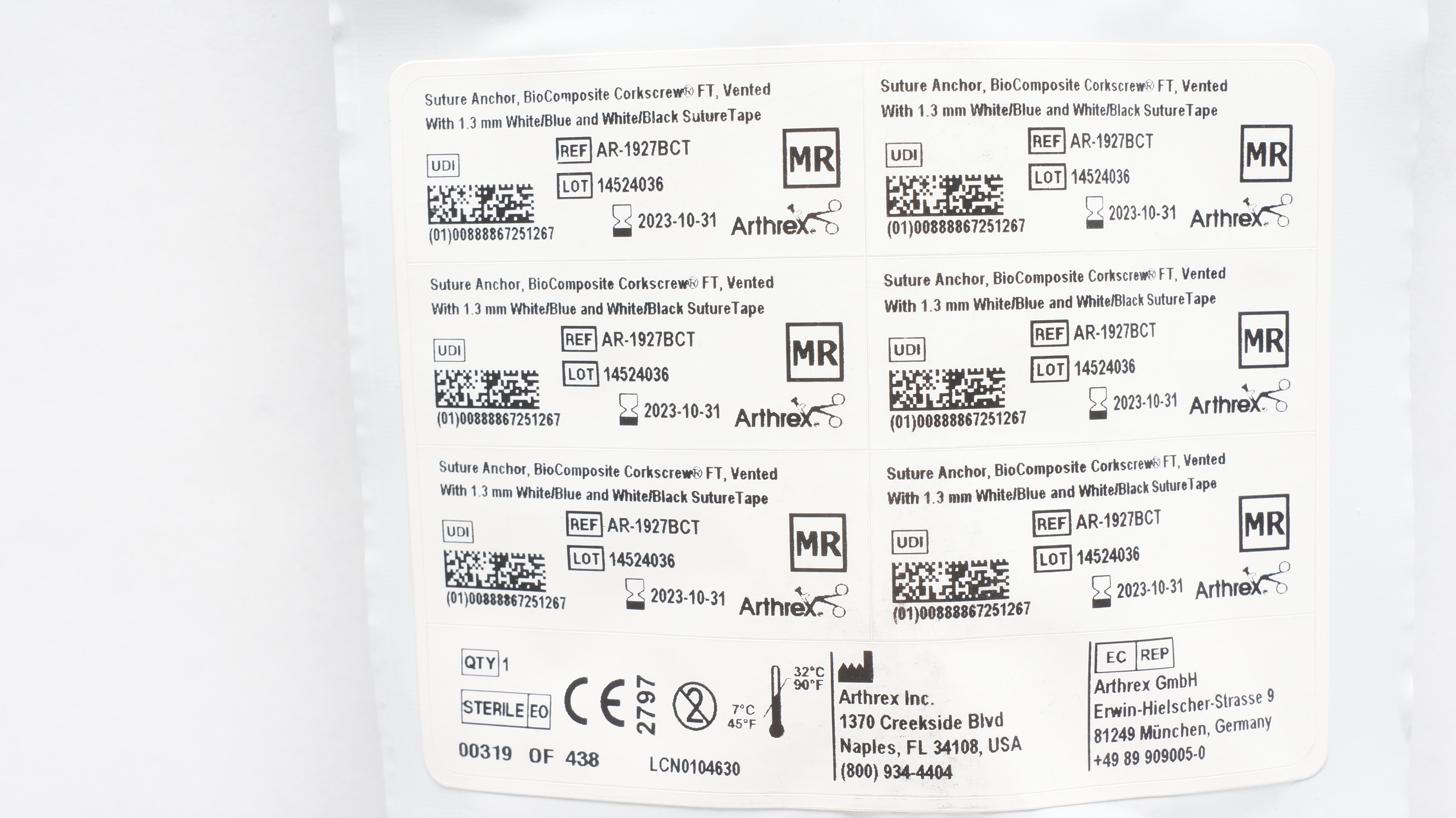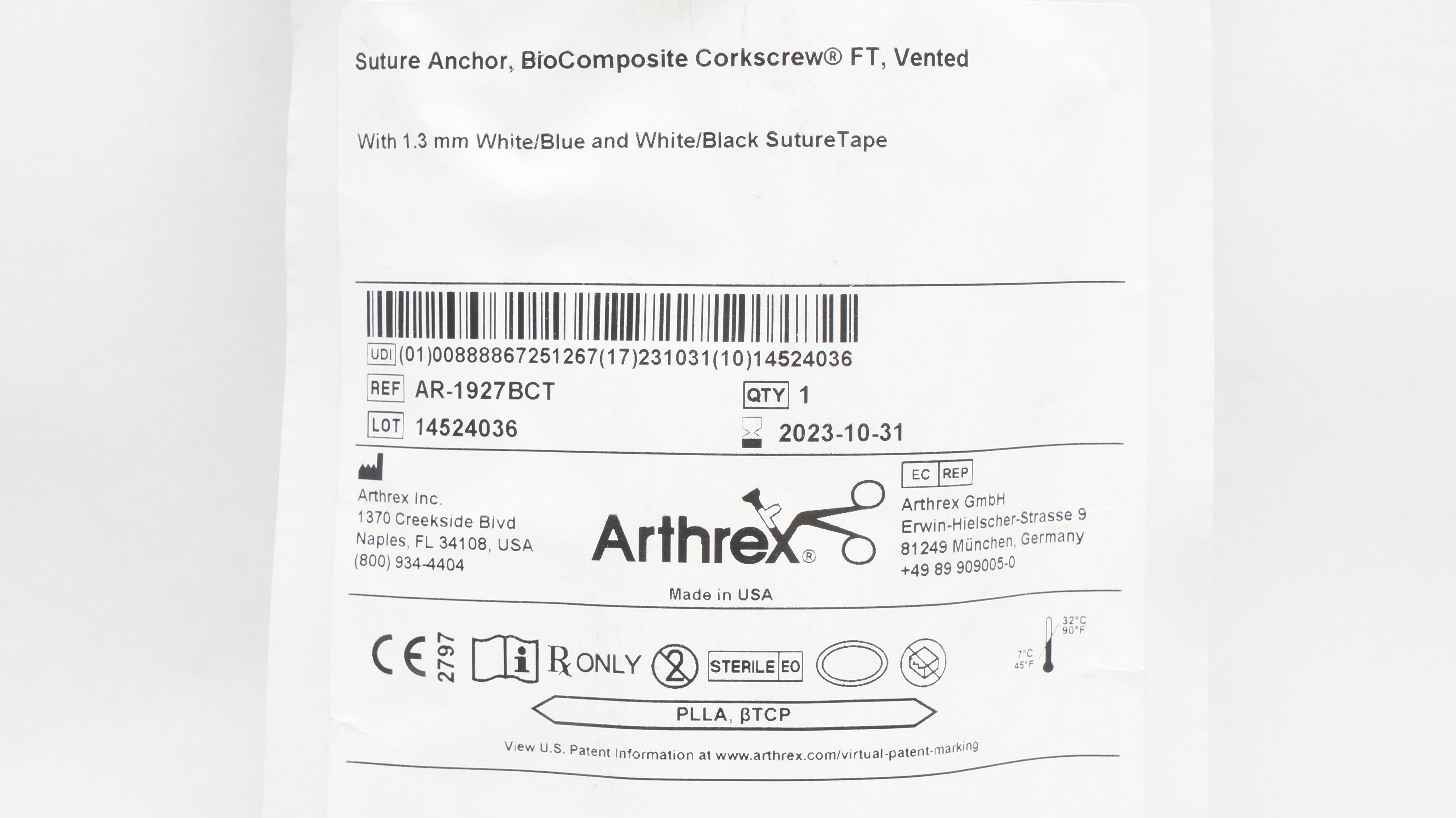 Arthrex AR-1927BCT Suture Anchor BioComposite Corkscrew FT Vented With 1.3mm White/Blue and White/Black Suture Tape 5.5inch x 14,7mm