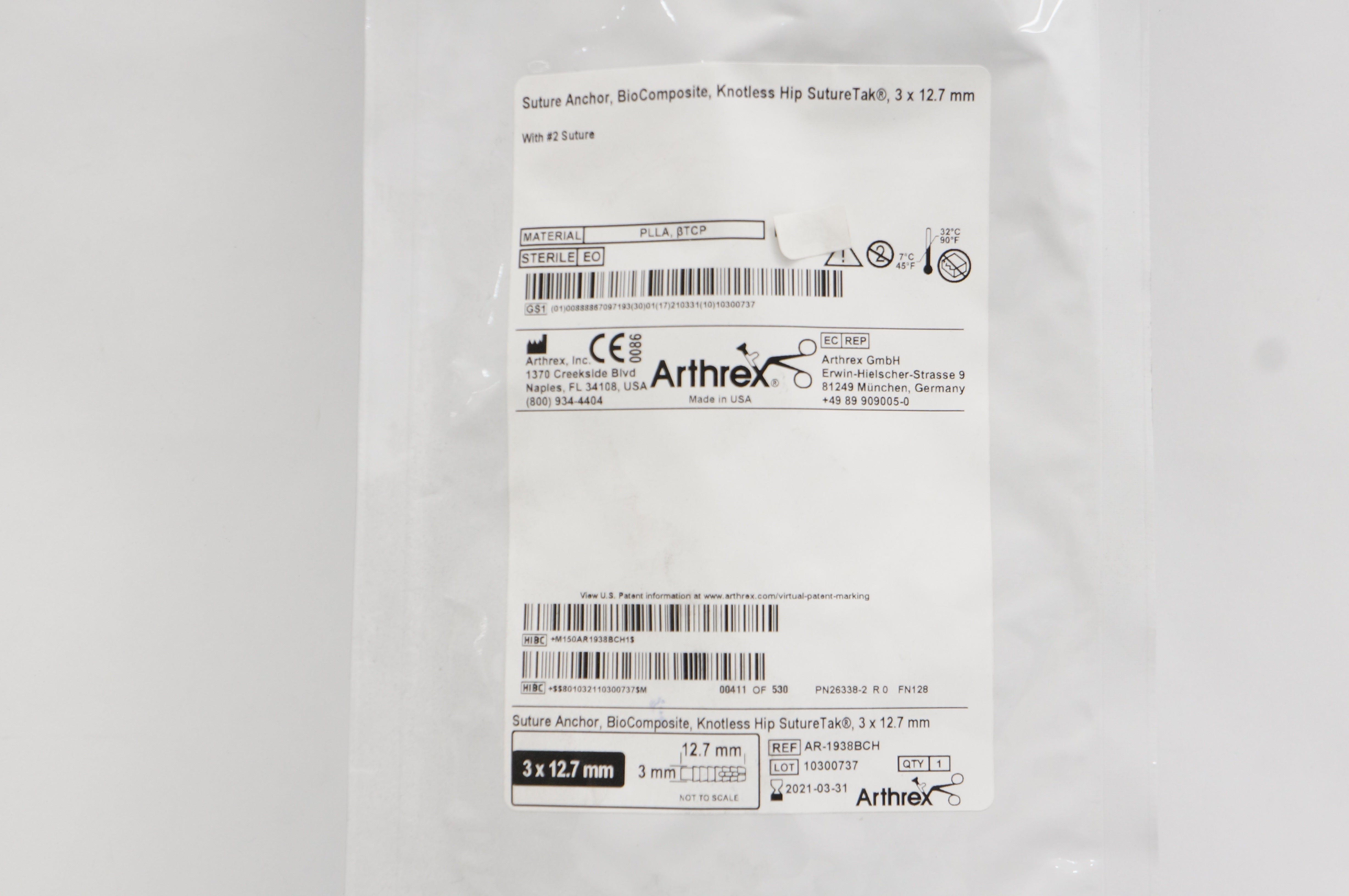Arthrex AR-1938BCH Stre Anchor, BioComposite,Knotless Hip Stre Tak 3 x 12.7mm(x)