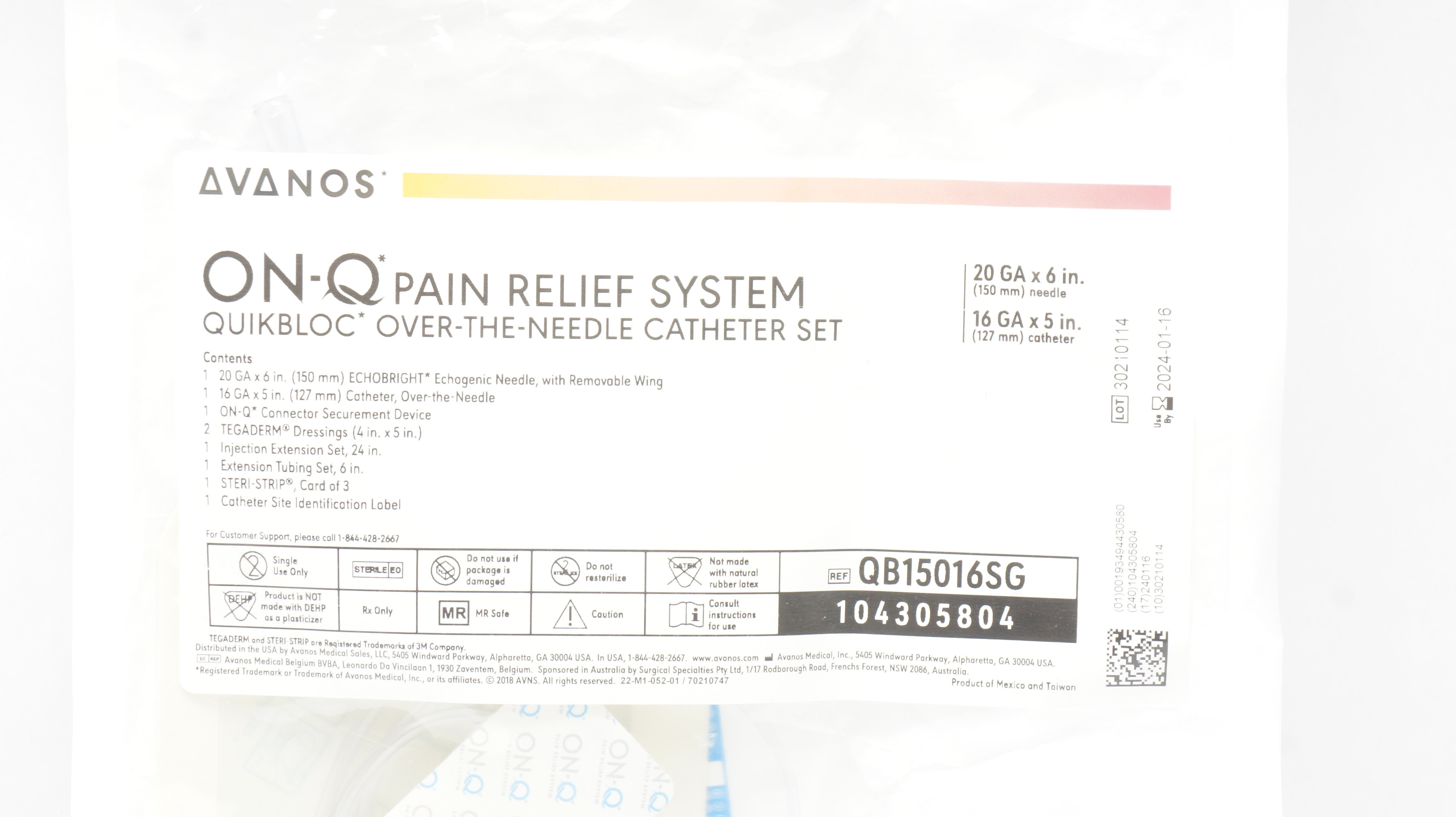 Avanos QB15016SGC ON-Q Quikbloc Over-The-Needle Catheter Set Stimulating 20Ga x 6inch 16Ga x 5inch