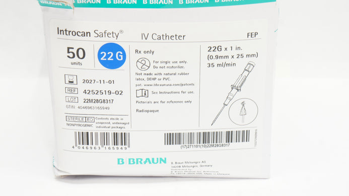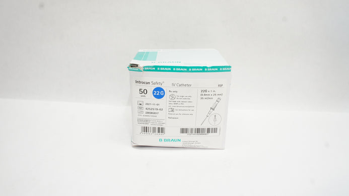 - B.Braun 4252519-02 Introcan Safety IV Cath. 22G x 1inch x 35ml/min - Box of 50