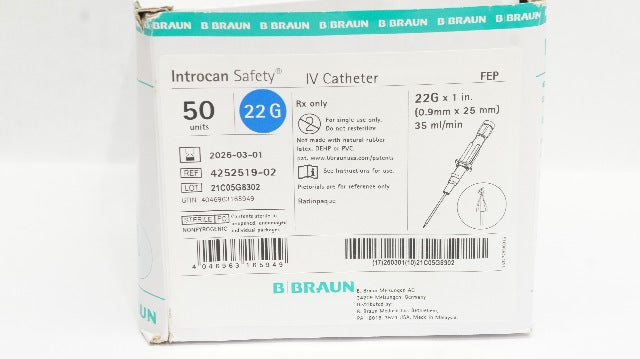 - B.Braun 4252519-02 Safety IV Cath. 22G x 1inch x 35ml/min - Box of 36