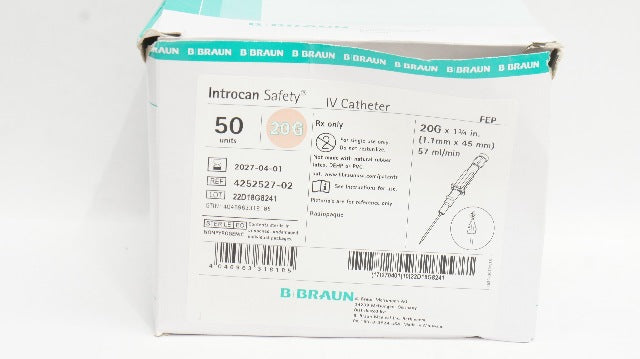 - B.Braun 4252527-02 Introcan Safety IV Cath. 20G x 1-3/4inch 57ml/min - Box of 23