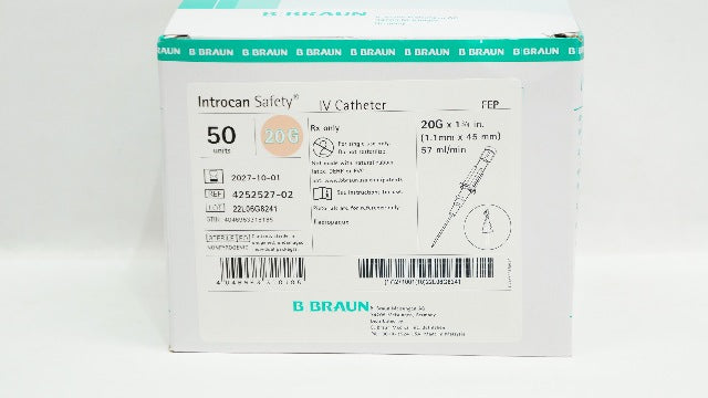 - B.Braun 4252527-02 Introcan Safety IV Cath. 20G x 1-3/4inch 57ml/min - Box of 50