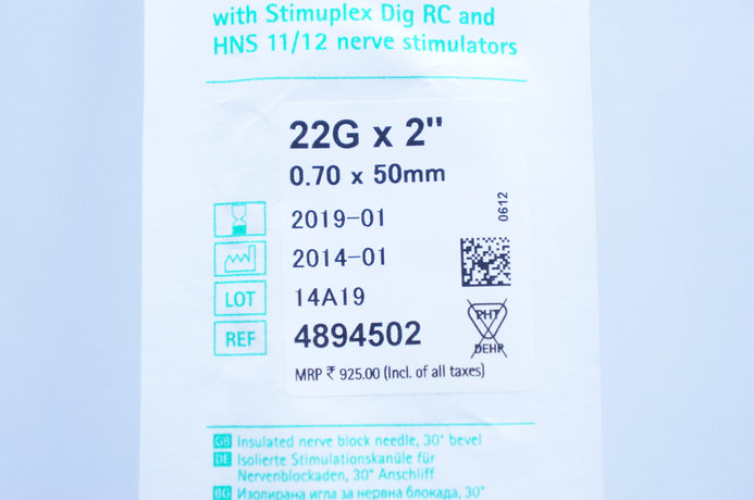 B.Braun 4894502 Stimuplex A Insulated Needle for use with Stimuplex Dig RC and HNS 11/12 nerve stimulators 22G x 2in