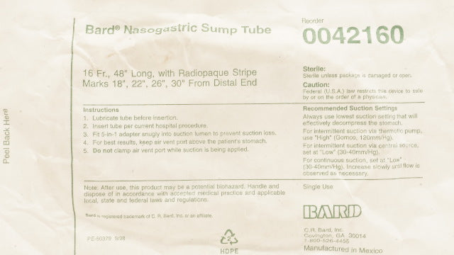 - Bard 0042160 Nasogastric Sump Tube w/Radiopaque Stripe, 16Fr x 48inch