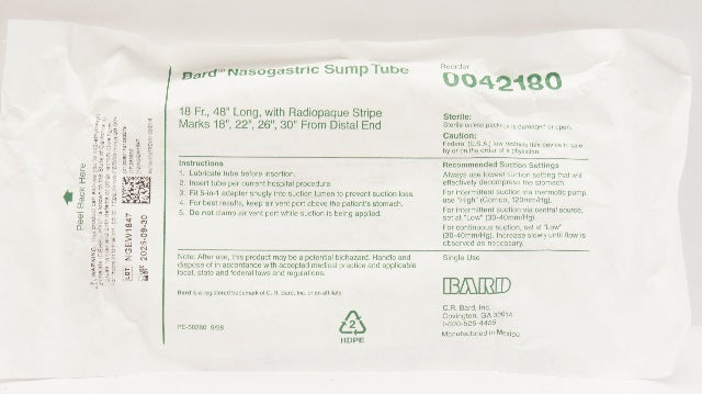 - Bard 0042180 Nasogastric Sump Tube w/ Radiopaque Stripe Marks 18Fr x 48inch