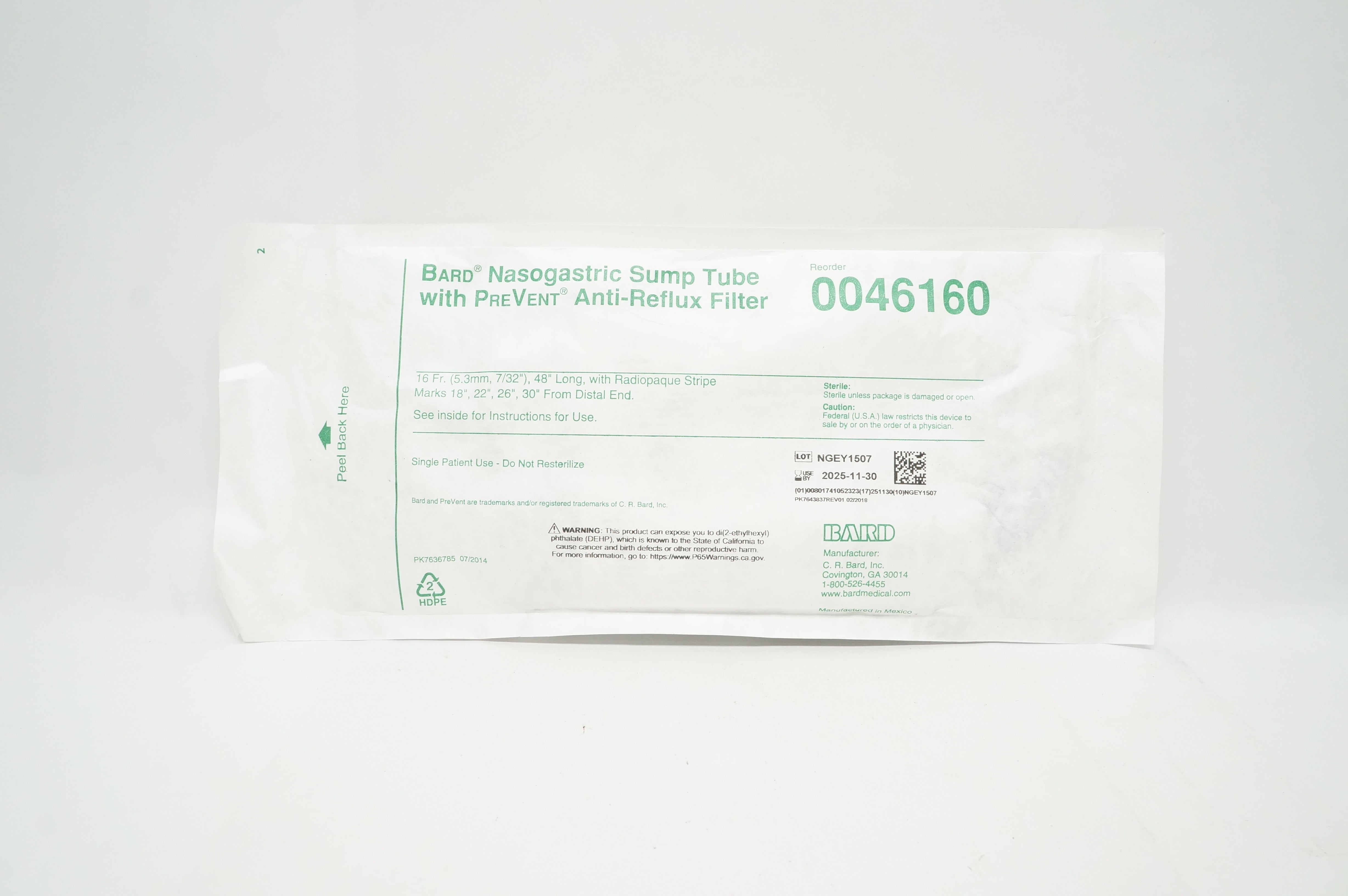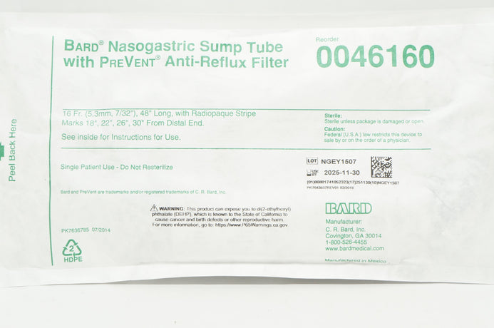 - Bard 0046160 Nasogastric Sump Tube With PreVent Anti-Reflux Filter 16Fr