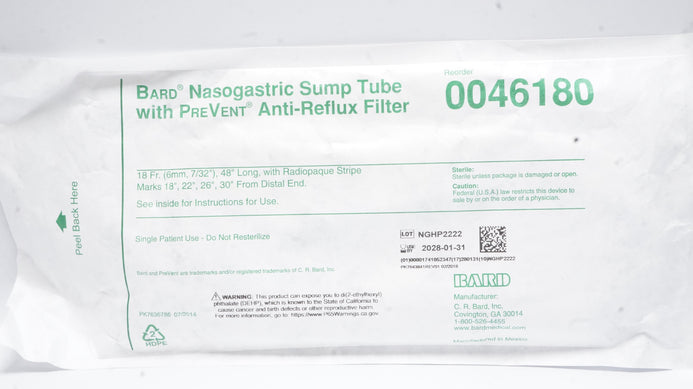 - Bard 0046180 Nasogastric Sump Tube with PreVent Anti-Reflux Filter 18Fr x 48inch