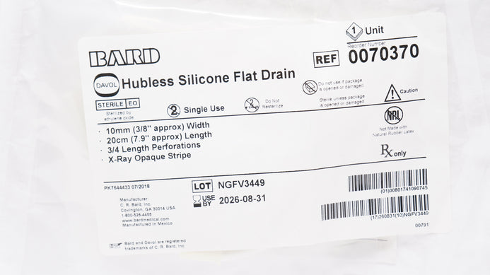- Bard 0070370 Davol Hubless Silicone Flat Drain 3/8inch x 7.9inch