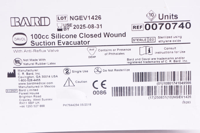 - Bard 0070740 Davol 100cc Silicone Closed Wound Suction Evacuator - Box of 10