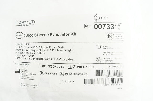 - Bard 0073310 Evacuator Kits, Silicone, 100cc, Round Drain, Trocar, 1/8in