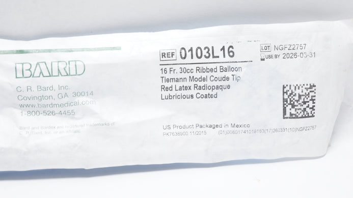 Bard 0103L16 Bardex Foley Catheter 16Fr 30cc Ribbed Balloon Tiemann Model Coude Tip Red Latex Radioaque Lubricious Coated