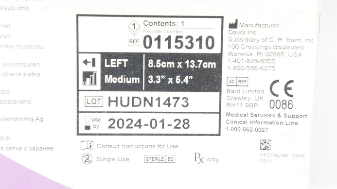 - Bard 0115310 Davol 3D Max Knitted Polypropylene Pre-Formed Mesh 3.3 x 5.4inch(x)