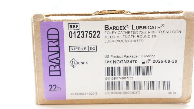 Bard 01237522 Bardex Lubricath Foley Catheter 22Fr Ribbed Balloon 75cc Medium Length Round Tip Lubricious Coated