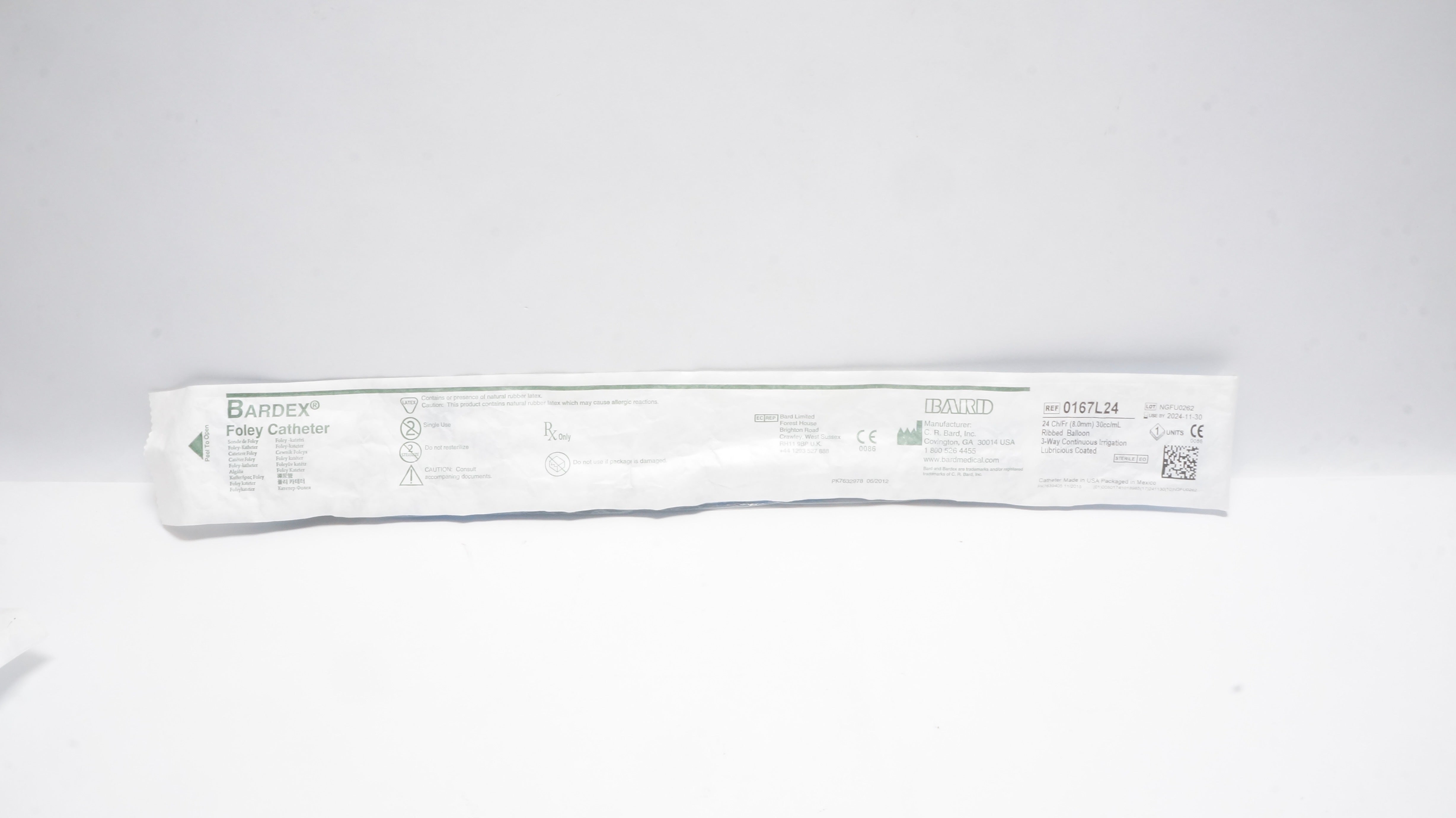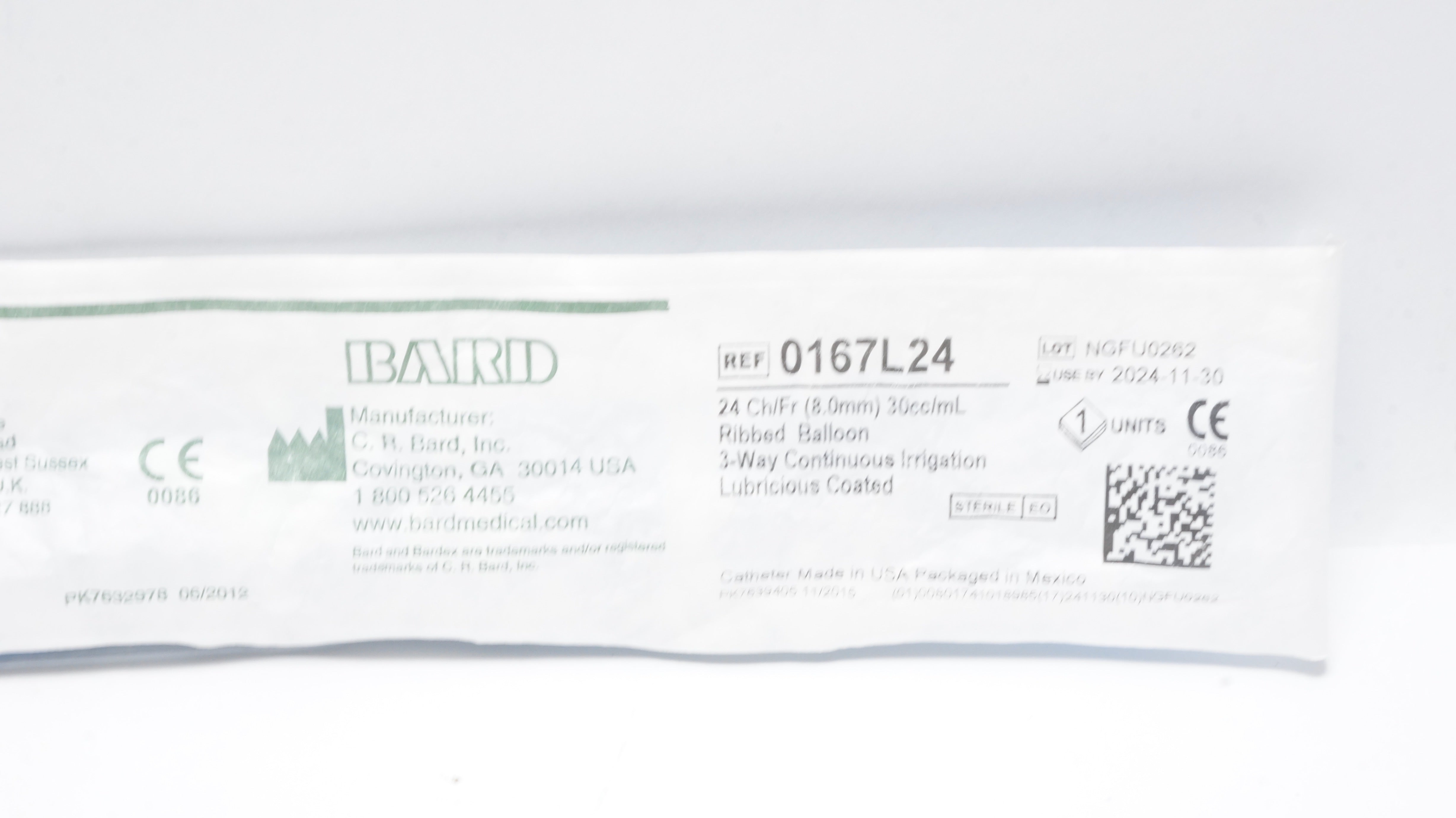 Bard 0167L24 Bardex Foley Lubricious Coated Catheter 24Ch/Fr 30cc/mL Ribbed Balloon 3-Way Continuous Irrigation
