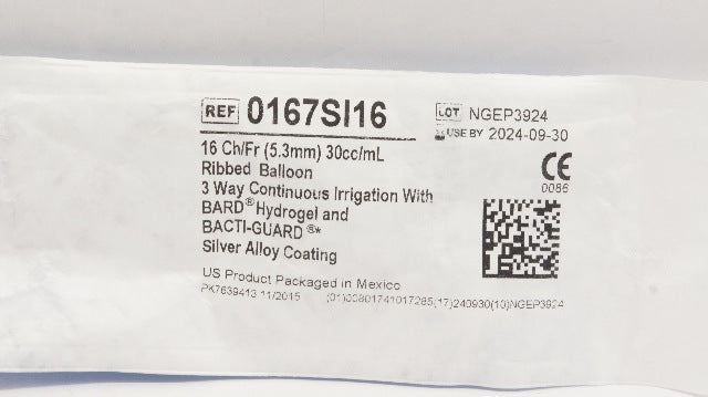 - Bard 0167SI16 Bardex IC Anti-Infective Foley Cath.16Ch/Fr 30cc/mL Ribbed Balloon