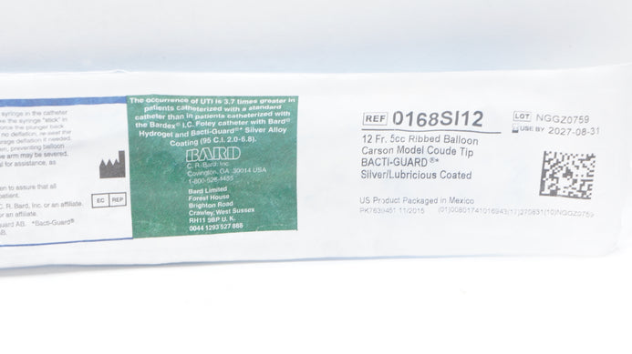 Bard 0168SI12 Bardex I.C. Anti-Infective Foley Catheter 12 Fr 5cc Ribbed Balloon Carson Model Coude Tip Bacti-Guard Silver/Lubricious Coated