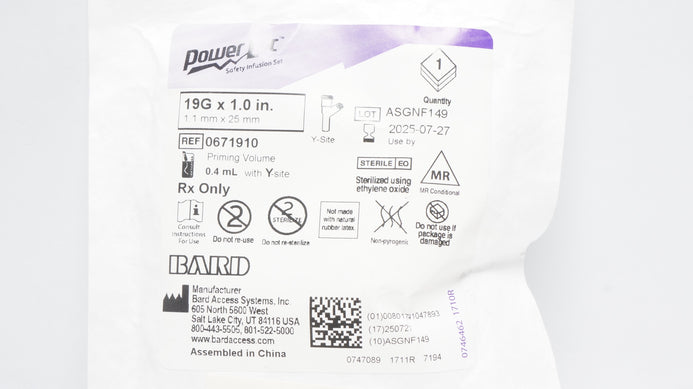 - Bard 0671910 Power Loc Safety Infusion Set 19G x 1.0in Priming Volume 0.4mL (x)