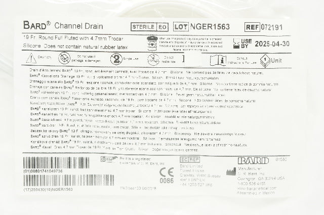Bard 072191 Channel Drain 19 Fr. Round Full Fluted With 4.7mm Trocar Silicone