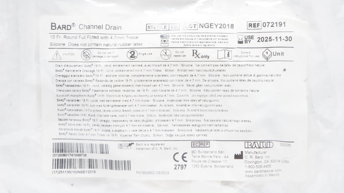 Bard 072191 Channel Drain 19 Fr. Round Full Fluted With 4.7mm Trocar Silicone