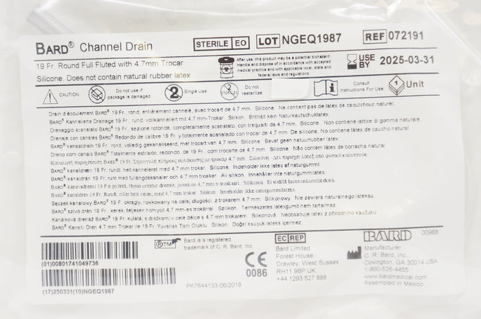 - Bard 072191 Channel Drain 19F Round Full Fluted With 4.7mm Trocar, Silicone
