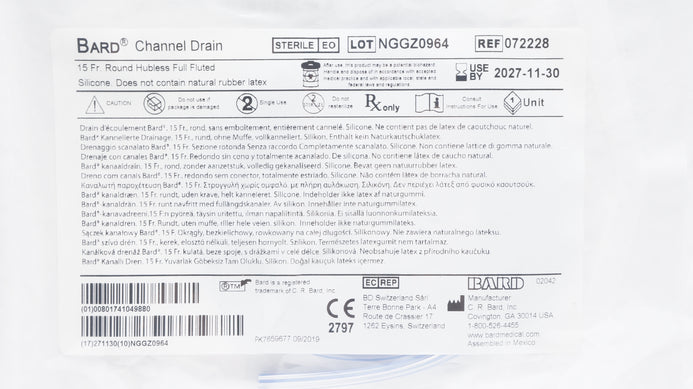 Bard 072228 Channel Drain Round Hubless Full Fluted, Silicone 15Fr
