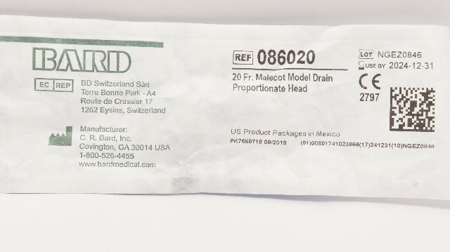 Bard 086020 Urethral Cath. 20Fr Malecot Model Drain Proportionate Head