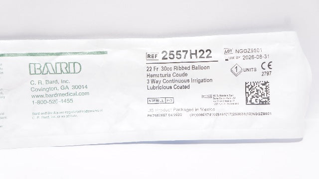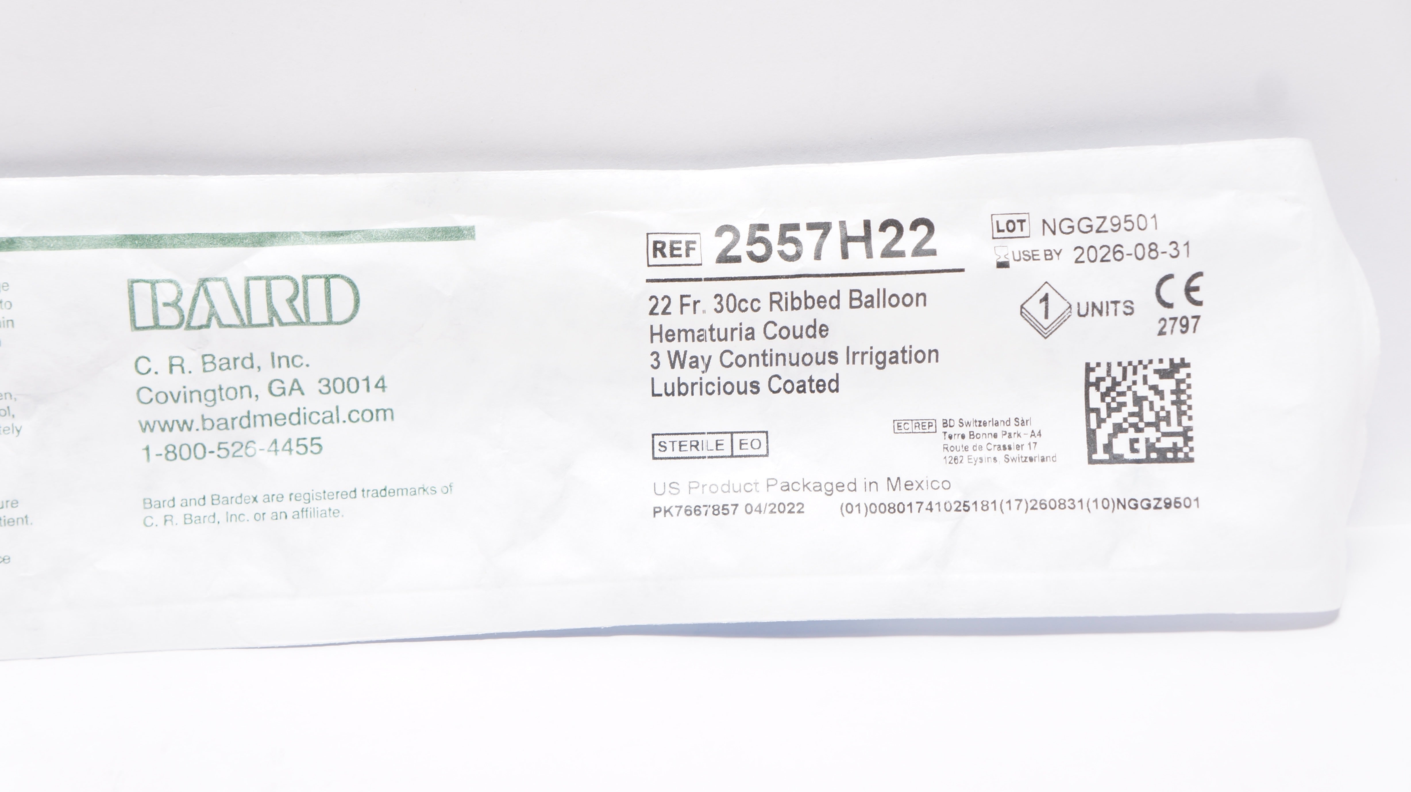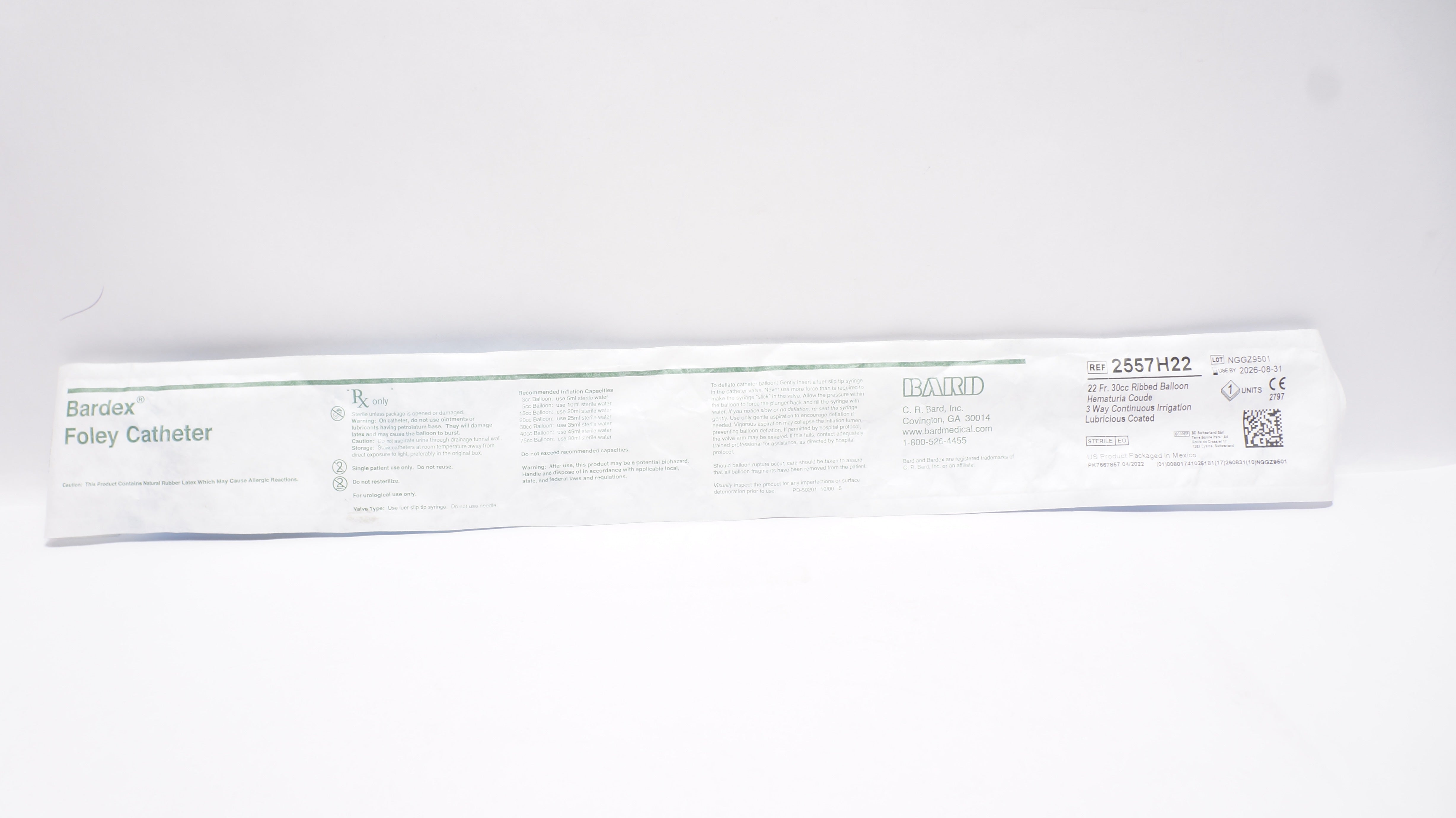 Bard 2557H22 Bardex Foley Catheter 22Fr 30cc Ribbed Balloon Hematuria Coude 3-Way Continuous Irrigation Lubricious Caoted